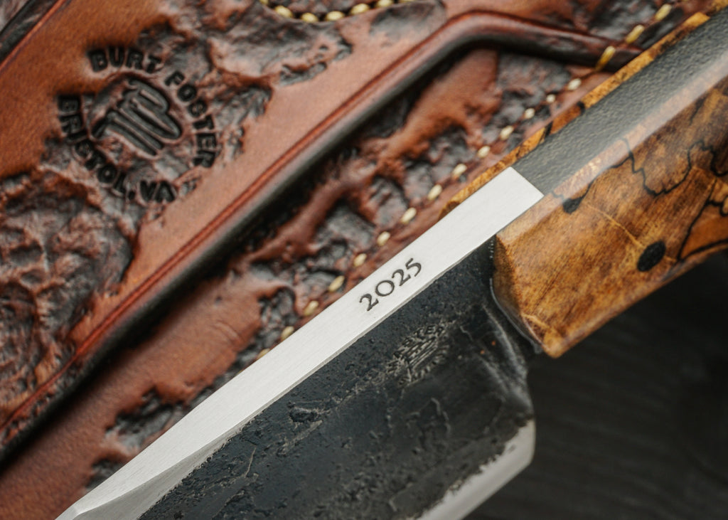 The frame handle is composed of spalted maple “scales”, sculpted and fitted to a tapered black micarta frame. I thought the intentional contrast of the frame with the material lent a composite full-tang look to the whole piece.