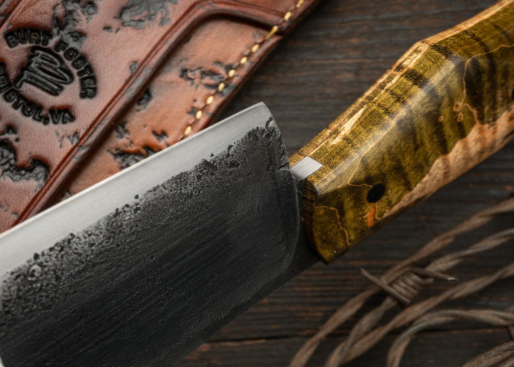 The blade with its hidden tang are forged to shape from 80CRV2, with particular attention paid to the forged plunges and the extra thin cross section (which is nearly hollow), mated to a hand-finished convex edge and swedge grind.