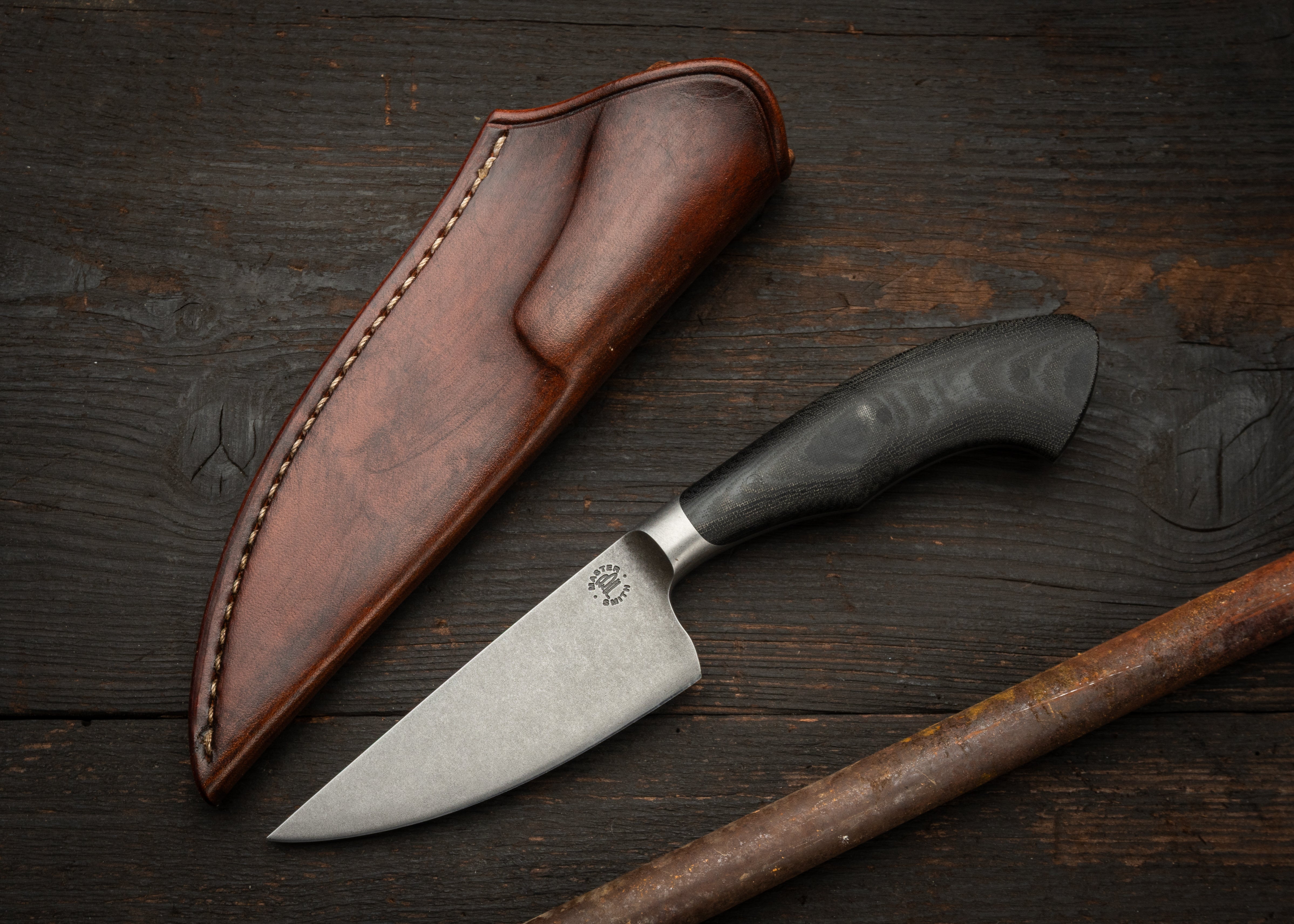 The black linen micarta handle scales are ground to mate to the curved transitions of the steel and secured with micarta pins.