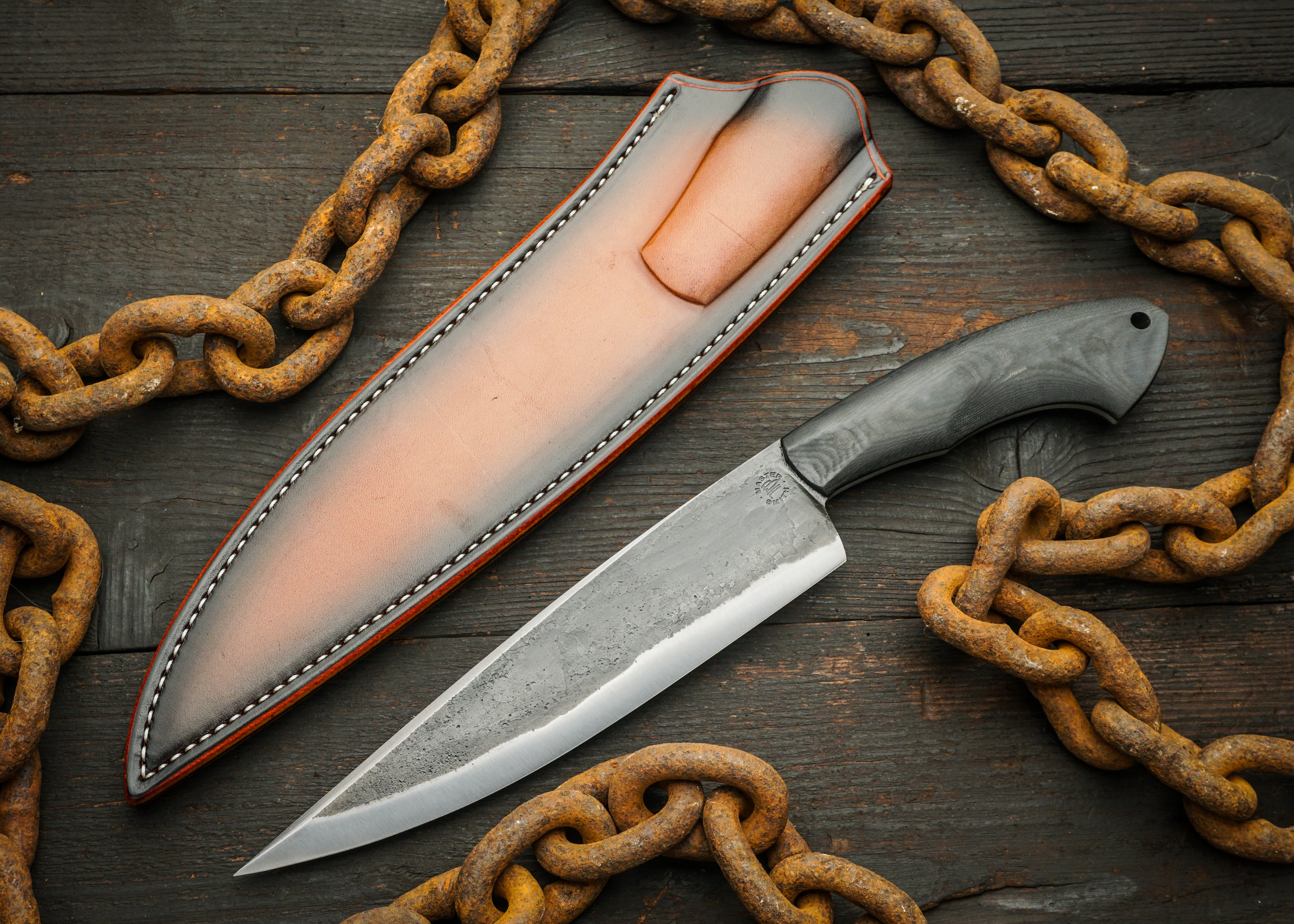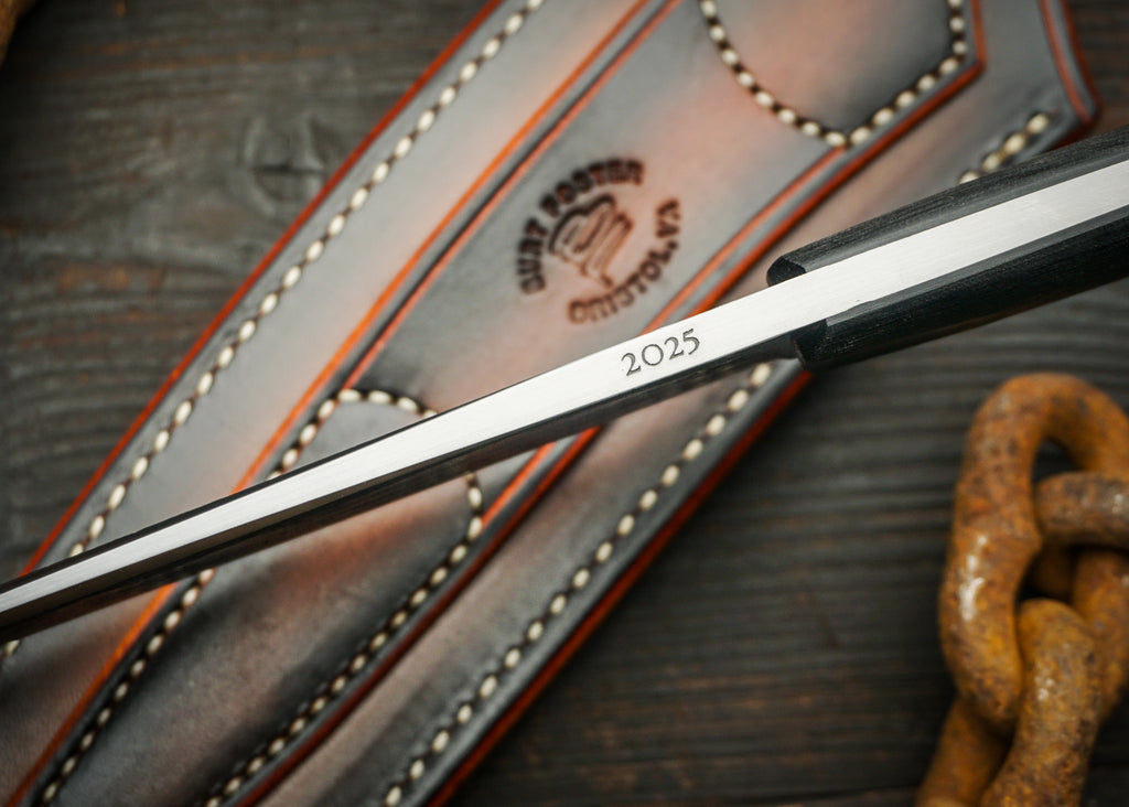 The blade is 80CRV2, forged very close to shape, with minimal grinding to bring it to a razor edge. Natural forge texture covers most of the blade surface with the area near the cutting edge satin finished.